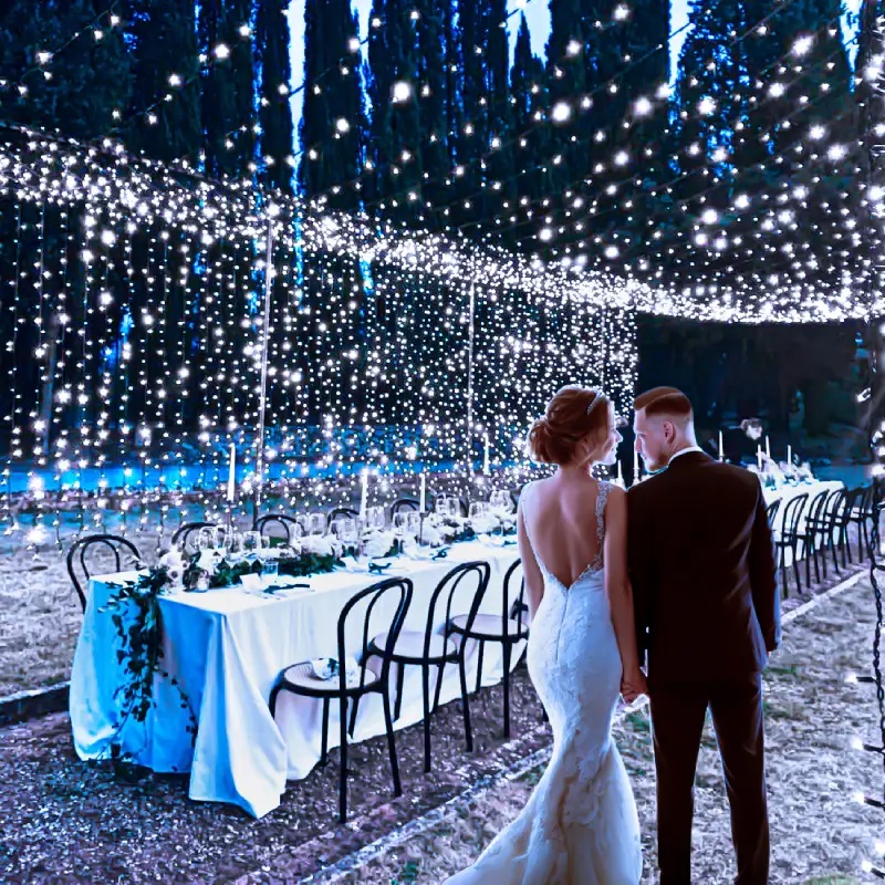 Пусть свет будет не только точечным, но и волшебным. Используйте гирлянды с тёплым желтоватым свечением: оплетите ими спинку стула молодожёнов, драпировки на стенах, потолок или дерево в центре зала. Можно добавить подвесные светильники в виде звёзд или хрустальных капель. Такое освещение создаст эффект звёздного неба или снежного сияния.